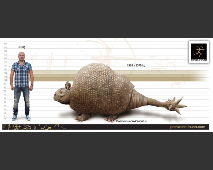| Armadillos, much like sloths, were represented by a variety of huge and bizarre forms, Doedicurus clavicaudatus happened upon an approximation of the ankylosaur body plan. |