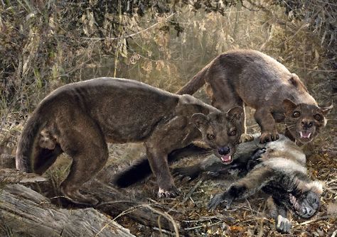 | The Americas had this huge range of predators 12kya: Panthera atrox, (American "lion" the largest cat of all time), the sabretooth Smilodon fatalis (not as big as Smilodon populator, also present in that fauna assemblage), The scimitar-toothed Homotherium serum, the American cheetah Miracinonyx trumani, and the frickin' Dire Wolf (Depressingly, there were many more also wiped out) |